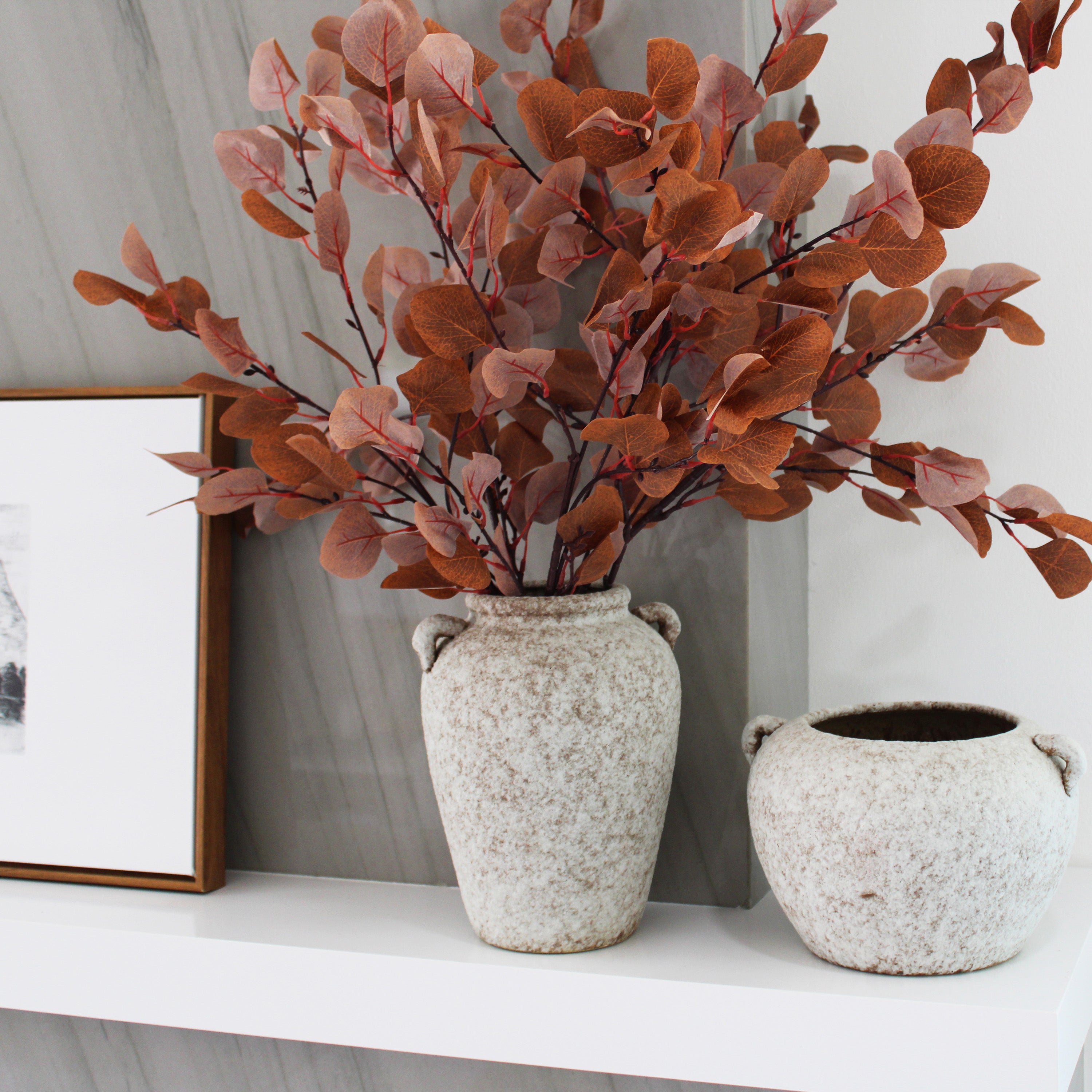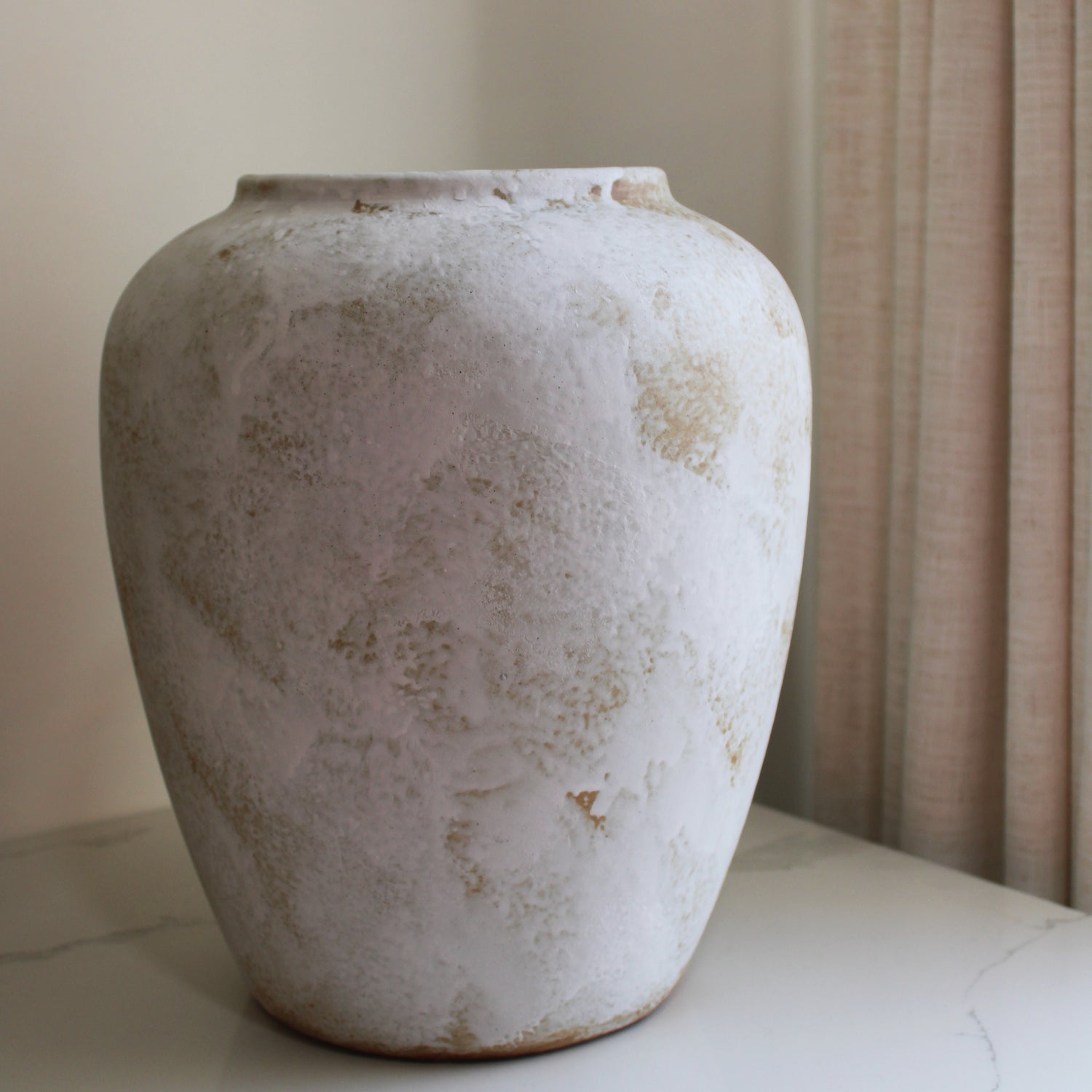 Elegant Cottage Mykono Handmade Vintage Terracotta Vase, Rustic Farmhouse Pottery White Washed Brush Stroke Vase